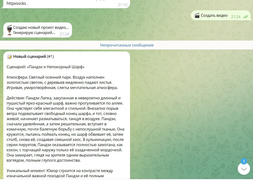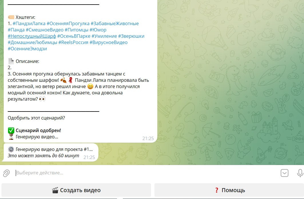 По расписанию автоматически генерирует сценарий видео и хеш-теги через ChatGPT API, генерирует видео по нему используя Sora/Veo3 и постит сторис в Instagram